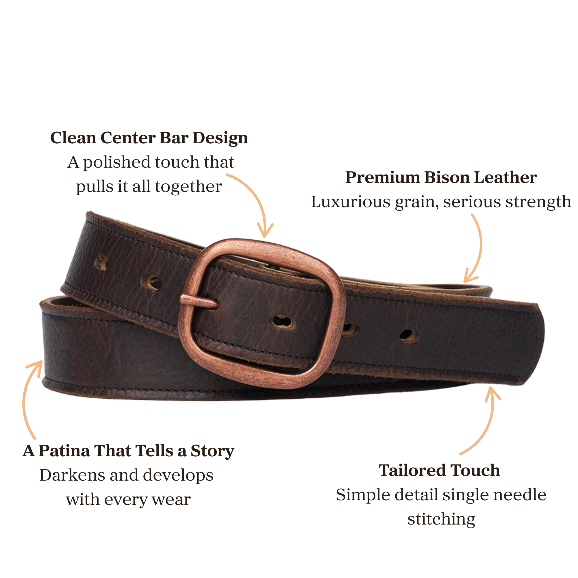 A fine line of stitching traces the strap, clean and consistent, framing the belt with quiet precision. And at the center, the antique copper buckle—rounded—pulls everything together with a warmth that complements both colorways: Stonewood Brown, a deep classic that leans rustic, and Stonewood Green, an earthy tone with contrast stitching that feels fresh but grounded. Lined with leather for extra comfort and structure.