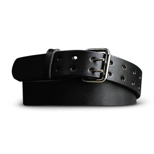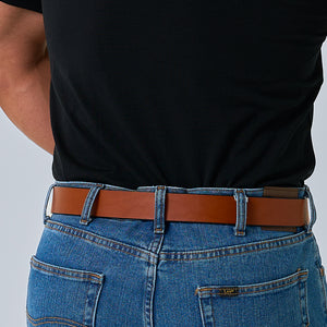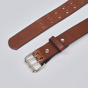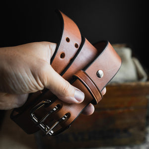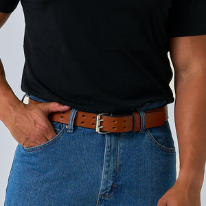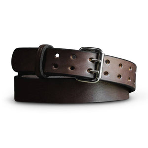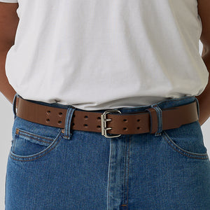 Brown leather belt with double prong polished nickel roller buckle, designed for carry use