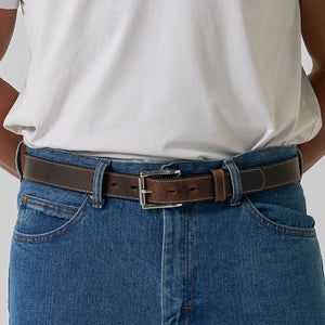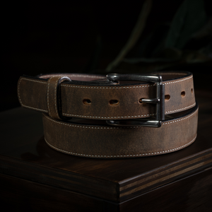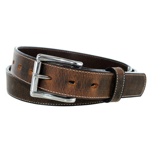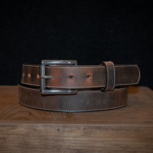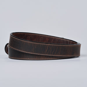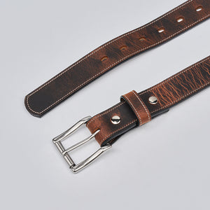 Dual layer brown bison leather belt with stainless steel roller buckle accompanied with single stitching needle