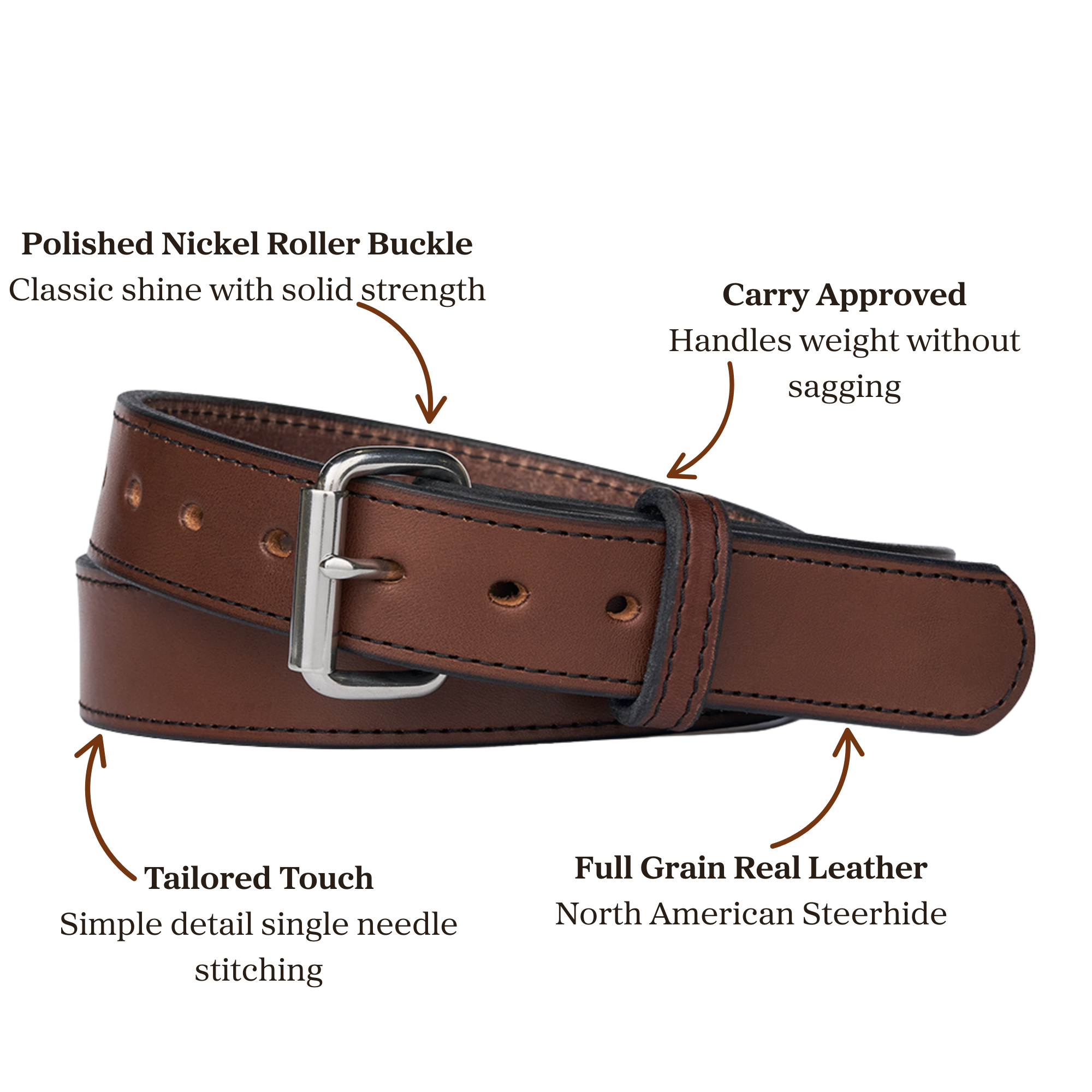 Made from solid 1-piece extra heavy duty leather we call "Extreme Leather" this belt will hold anything you want to hang on it. The decorative edge stitching gives it a more refined look so this belt looks good with a wide range of pant styles.