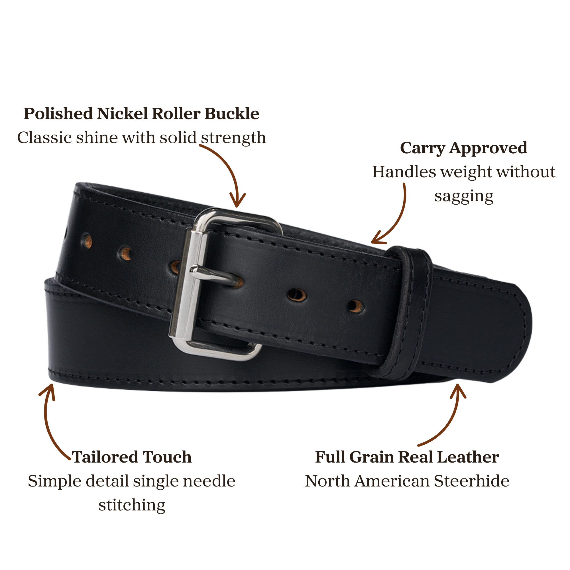 Made from solid 1-piece extra heavy duty leather we call "Xtreme Leather". The decorative edge stitching gives it a more refined look so this belt looks good with a wide range of pant styles.