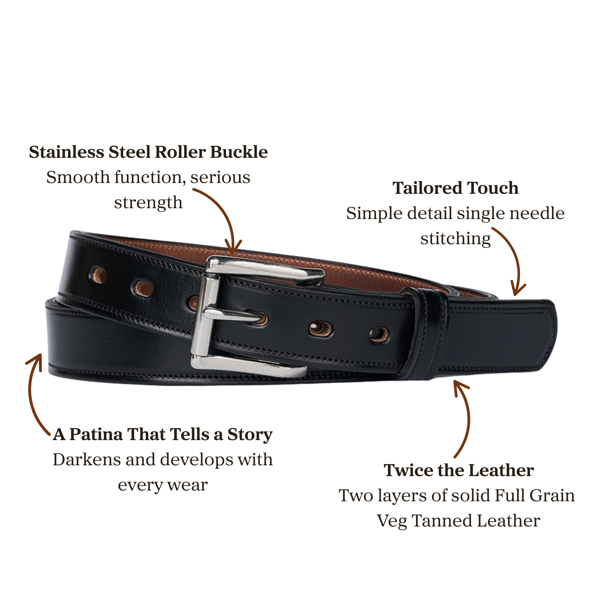 Vegetable-tanned leather develops a patina that uniquely improves with age. The character develops with wear giving each belt its own individual characteristics.