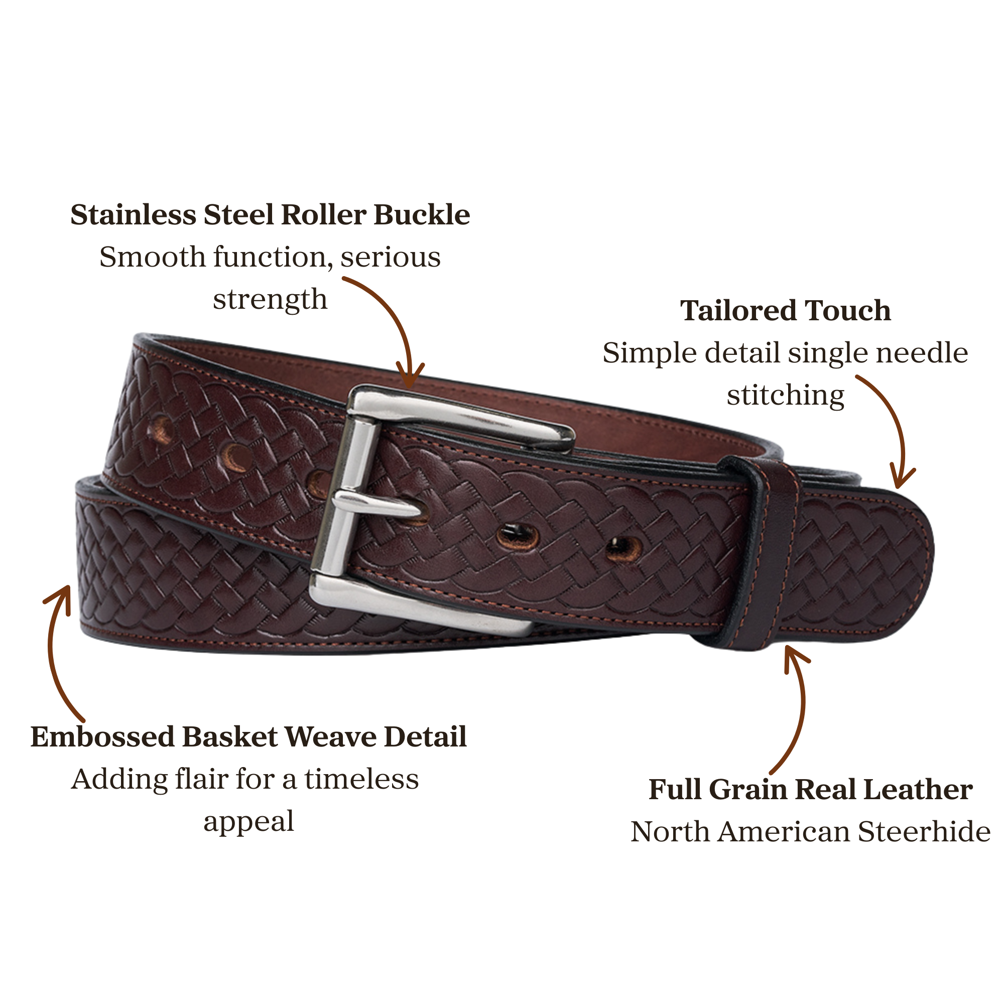 Made from premium USA vegetable-tanned steer hides, this belt will most likely last your entire life. The embossed basket weave gives just the right amount of flair and style when you want something a bit more than just a plain belt.