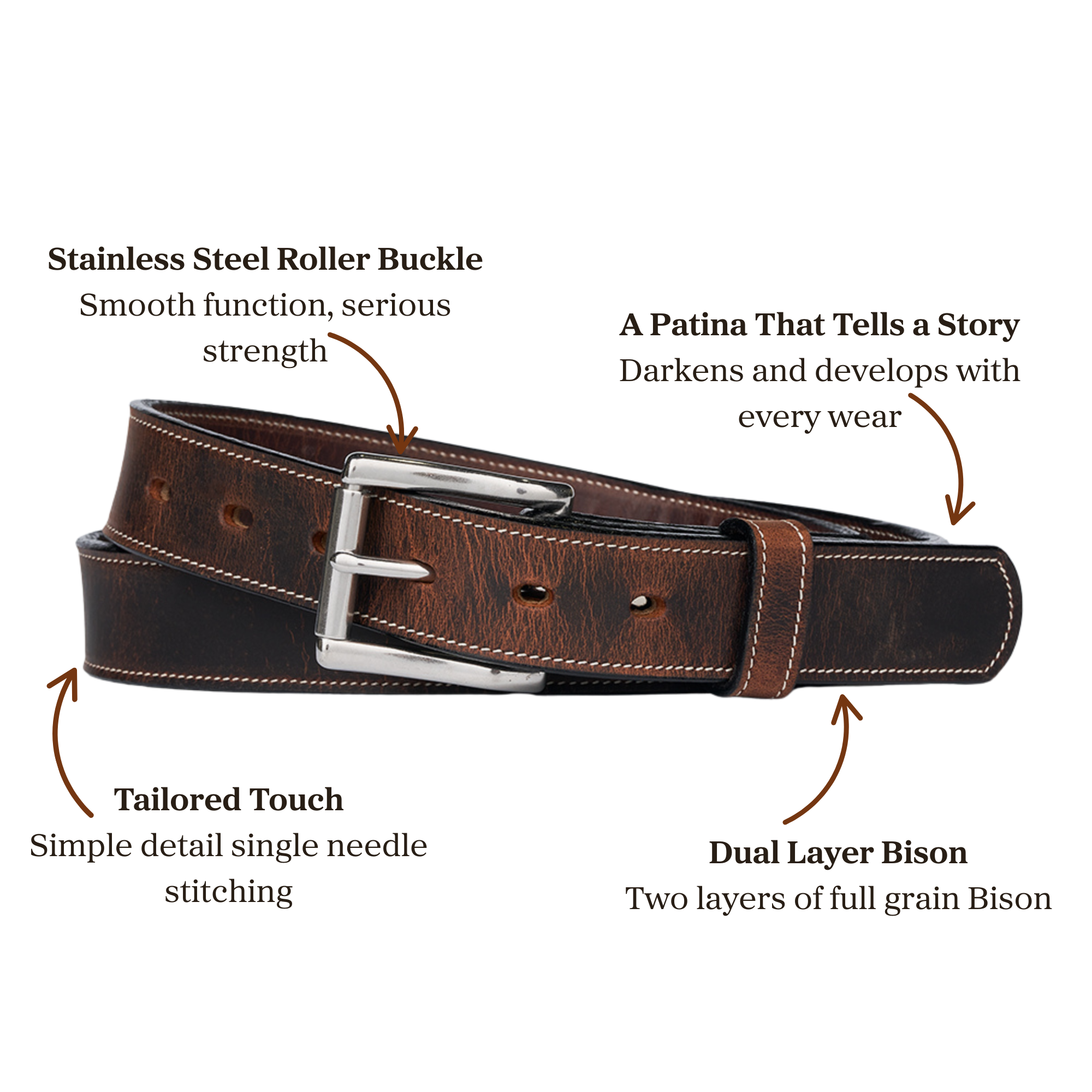 Introducing the Wyoming Bison Belt in 1.25" Width - a new addition to the Hanks Belts collection! Made from the same luxurious bison leather as our famous Montana Bison belt, this belt features a single white contrast stitching and a leather-lined back for added comfort and durability.