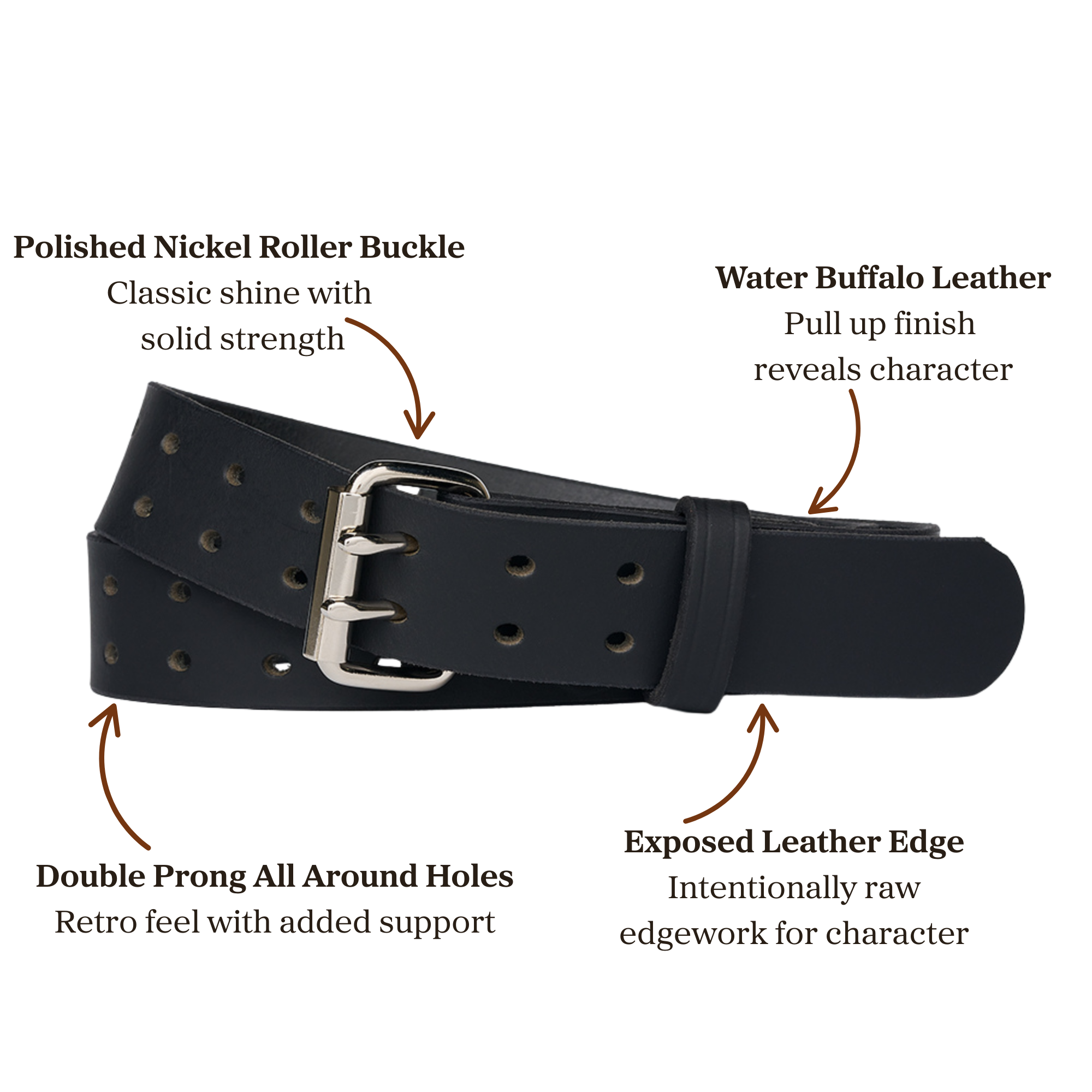 The heavy-duty double prong roller buckle is held on with Chicago Screws so it can be swapped out if you ever want to change the buckle style.