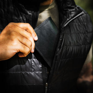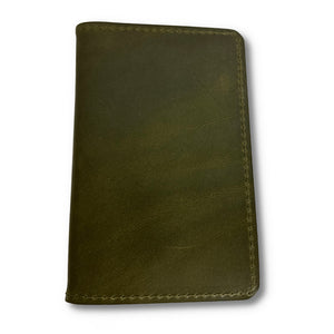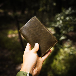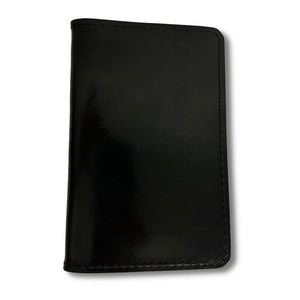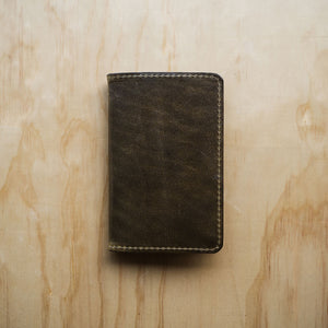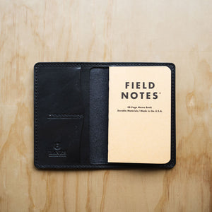 - Holds Field Note journal or passport on the left side. The right side has a large compartment and two credit card-sized compartments that hold cash, documents, and 2-4 cards.