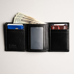 Step inside the world of impeccable organization with the Garda Trifold. Featuring 6 credit card slots that are gracefully arranged, 3 on each side, ensuring easy access to your most-used cards while maintaining a slim profile. Beneath each set of credit card slots, you'll find an additional slot to accommodate receipts, business cards, or even a spare key. The center windowed ID compartment allows you to display your identification, making it hassle-free to show your credentials when needed. Lastly, the bill compartment provides ample space for your cash.