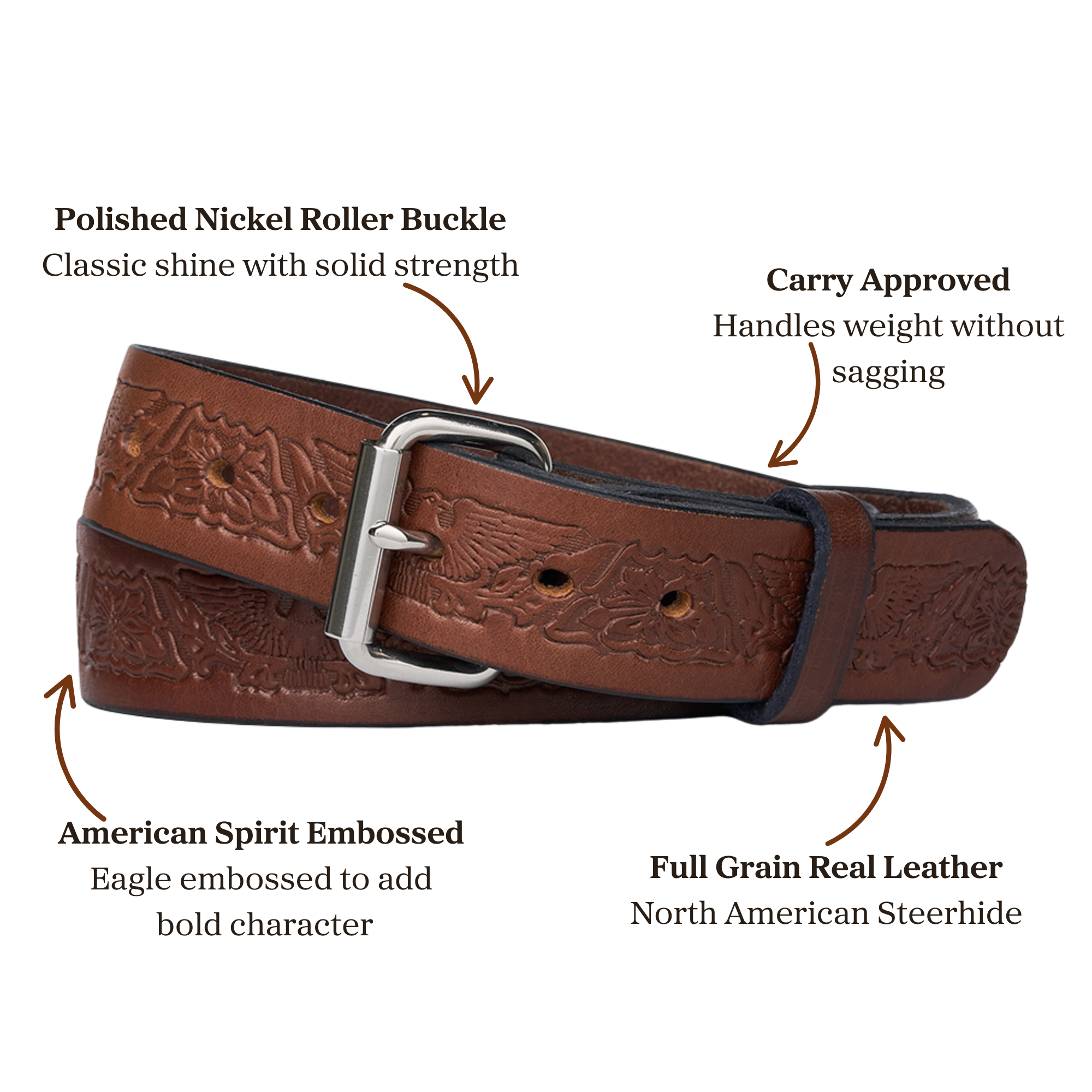 When you want a little more style added to your CCW Gun belt give the Hanks Belts Gunner Eagle a try. Our heavy full-grain leather is embossed with a handsome eagle print giving it just a bit more flair.