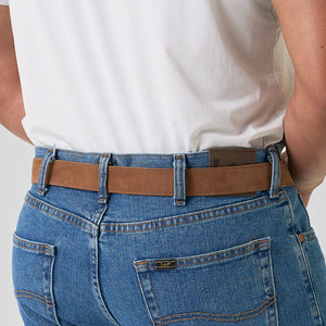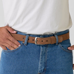 For the man who wants comfort without cutting corners, this USA-made suede belt delivers. Crafted from chocolate brown nubuck leather with a rich, velvety texture feel. Designed to be a 1.25" width for added flexibility and all-day wearability.