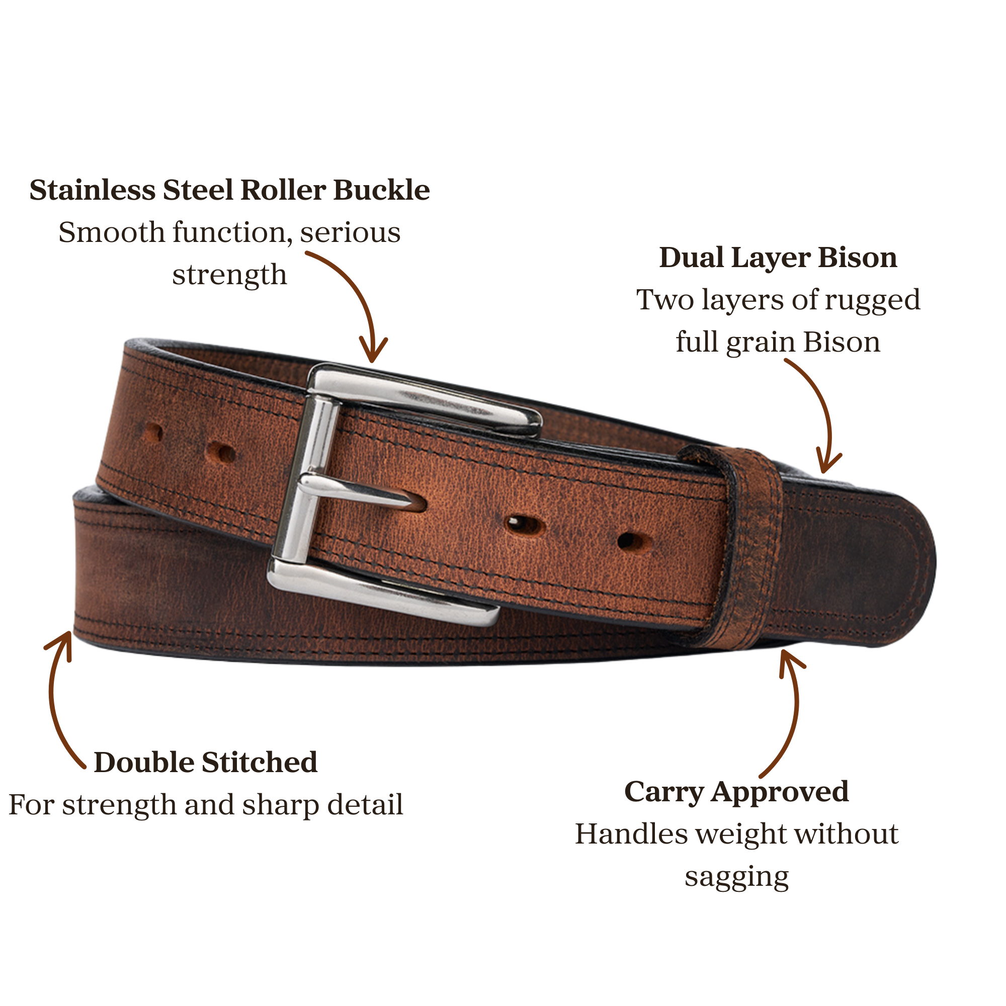 The Bison leather is supple, yet the dual layers give this belt the beef to support anything you want to hang off it. The double-needle stitching is rugged and will ensure this belt stays together for life.