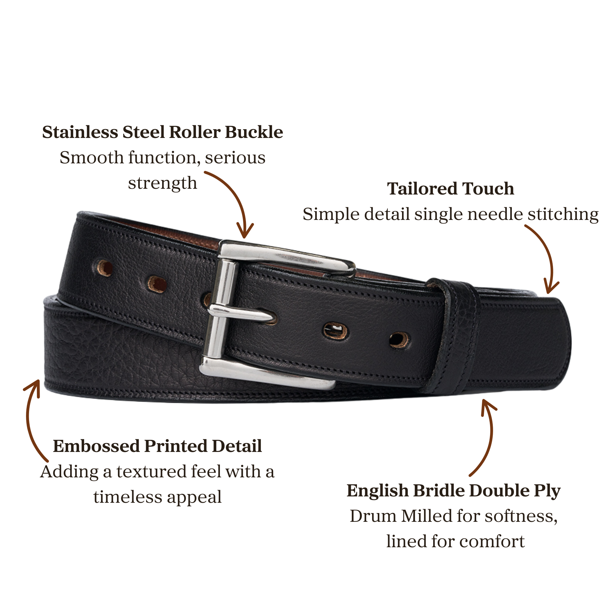We take the leather and emboss a nice texture on it and then return it to the milling drums to soften and condition it even further. We then back it up with a premium leather lining. The end result is one of our most luxurious belts ever. Soft and flexible but oh so sturdy.